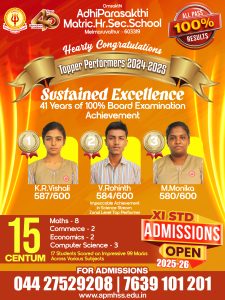 As ordained by ‘AMMA’ in the oracle, the Adhiparasakthi Charitable, Medical, Educational and Cultural Trust established Adhiparasakthi Matriculation School in 1985. It was upgraded to Higher Secondary School in the year 1991. The School has been certified ISO 9001:2015 for the quality education provided
